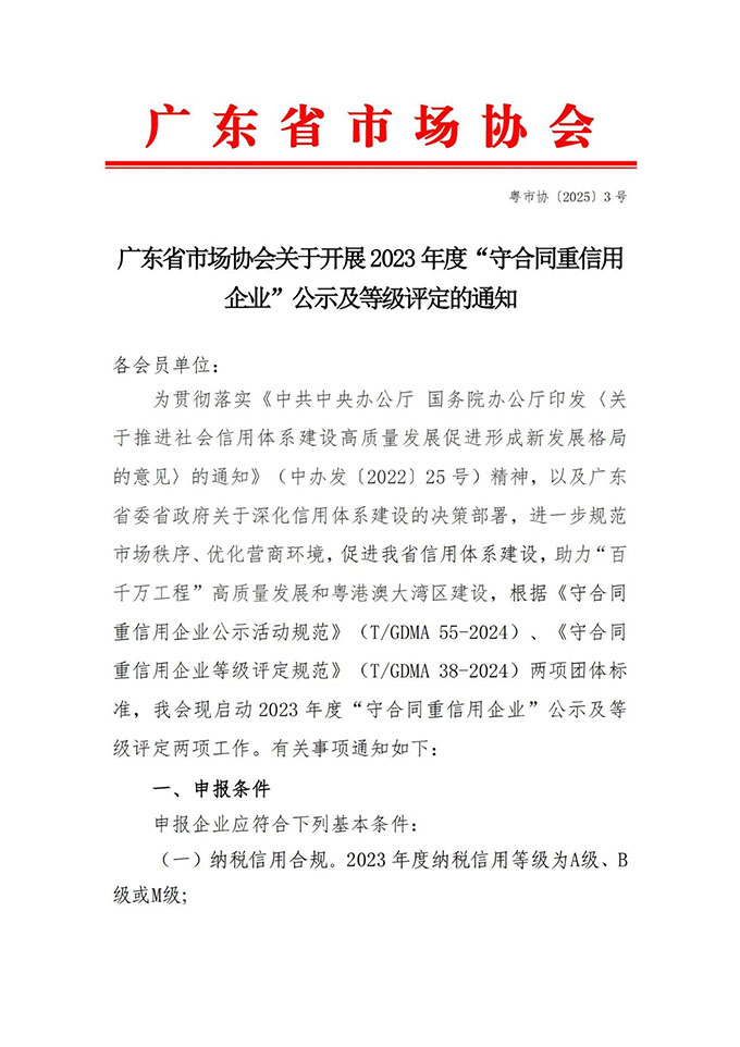 為貫徹落實(shí)《中共中央辦公廳 國務(wù)院辦公廳印發(fā)〈關(guān)于推進(jìn)社會信用體系建設(shè)高質(zhì)量發(fā)展促進(jìn)形成新發(fā)展格局的意見〉的通知》(中辦發(fā)〔2022〕25號)精神,以及廣東省委省政府關(guān)于深化信用體系建設(shè)的決策部署,進(jìn)一步規(guī)范市場秩序、優(yōu)化營商環(huán)境,促進(jìn)我省信用體系建設(shè),助力“百千萬工程”高質(zhì)量發(fā)展和粵港澳大灣區(qū)建設(shè),根據(jù)《守合同重信用企業(yè)公示活動規(guī)范》(T/GDMA 55-2024)、《守合同重信用企業(yè)等級評定規(guī)范》(T/GDMA 38-2024)兩項(xiàng)團(tuán)體標(biāo)準(zhǔn),我會現(xiàn)啟動2023年度“守合同重信用企業(yè)”公示及等級評定兩項(xiàng)工作。有關(guān)事項(xiàng)通知如下:
